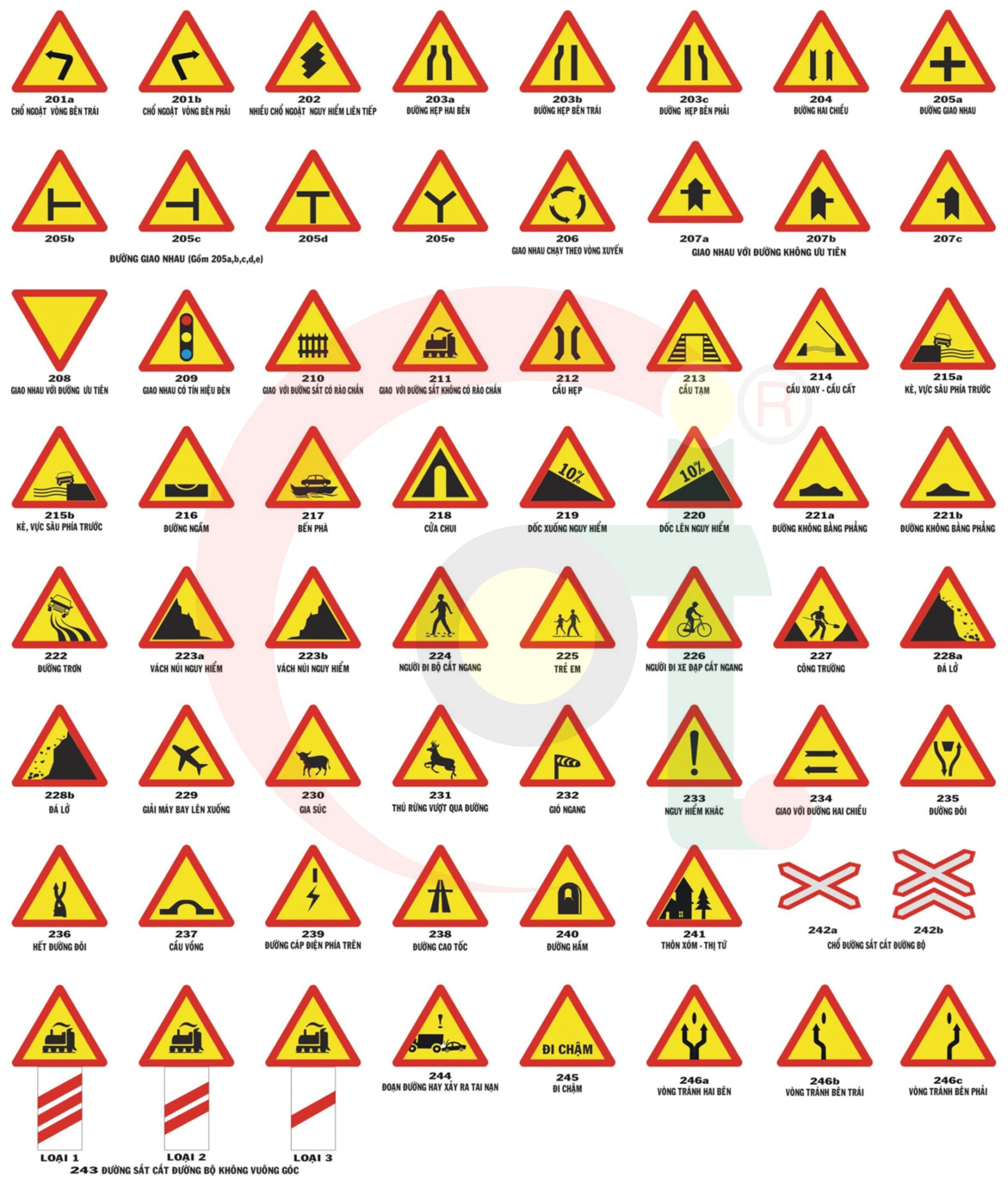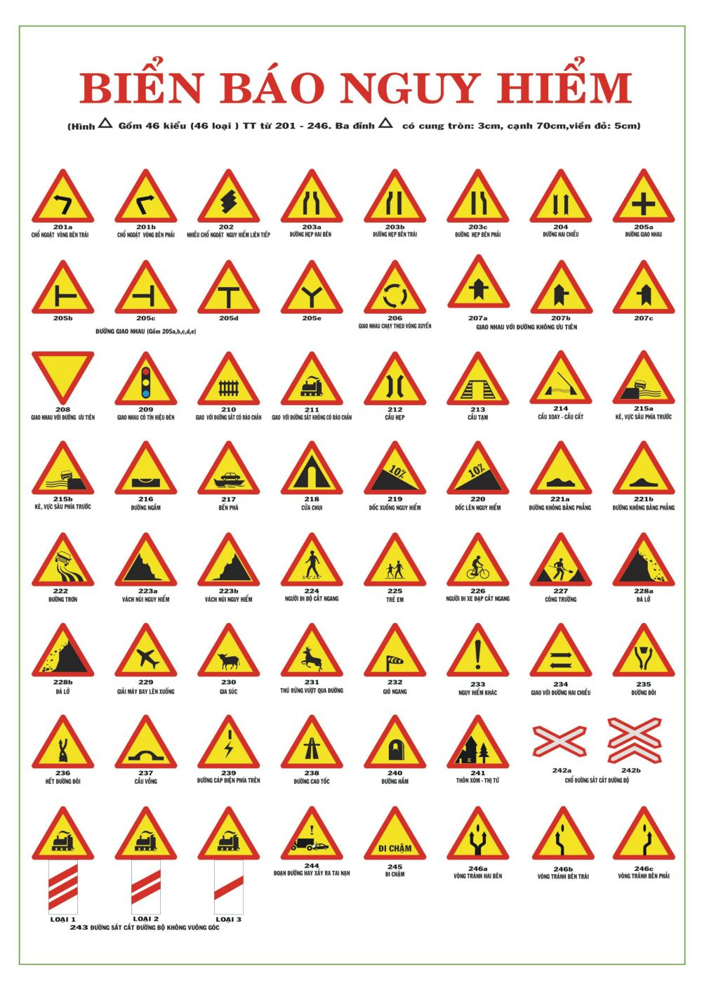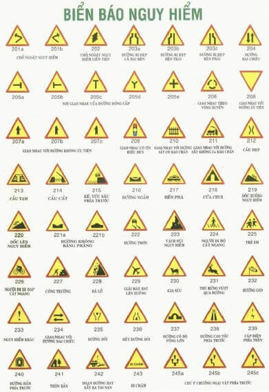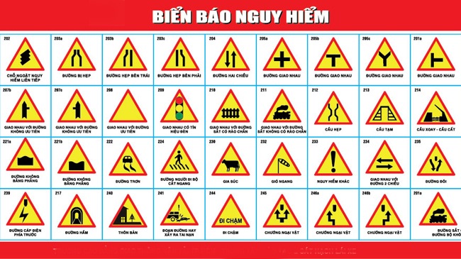 Trong hệ thống biển báo giao thông Việt Nam, nhóm biển báo nguy hiểm có tới 46 kiểu khác nhau, được ký hiệu từ 201 đến 245. Những biển báo này không chỉ đơn thuần là hình ảnh, mà còn là công cụ hữu ích để nhắc nhở và cảnh tỉnh mọi người về những rủi ro có thể xảy ra trên đường, từ việc đường hẹp đến những đoạn đường trơn trượt. Việc chú ý và tuân thủ các biển báo này sẽ giúp đảm bảo an toàn cho mọi người khi tham gia giao thông.
