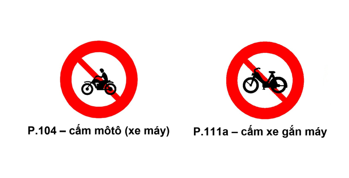 Có nhiều loại biển báo khác nhau liên quan đến việc cấm các loại xe máy và xe mô tô, trong đó có biển P.104 được sử dụng để cấm xe máy, và biển P.105 cấm tất cả các loại ô tô cùng xe mô tô. Đặc biệt, biển P.104 chỉ cấm xe máy, còn xe gắn máy có thể đi qua nếu không có biển báo cấm riêng.