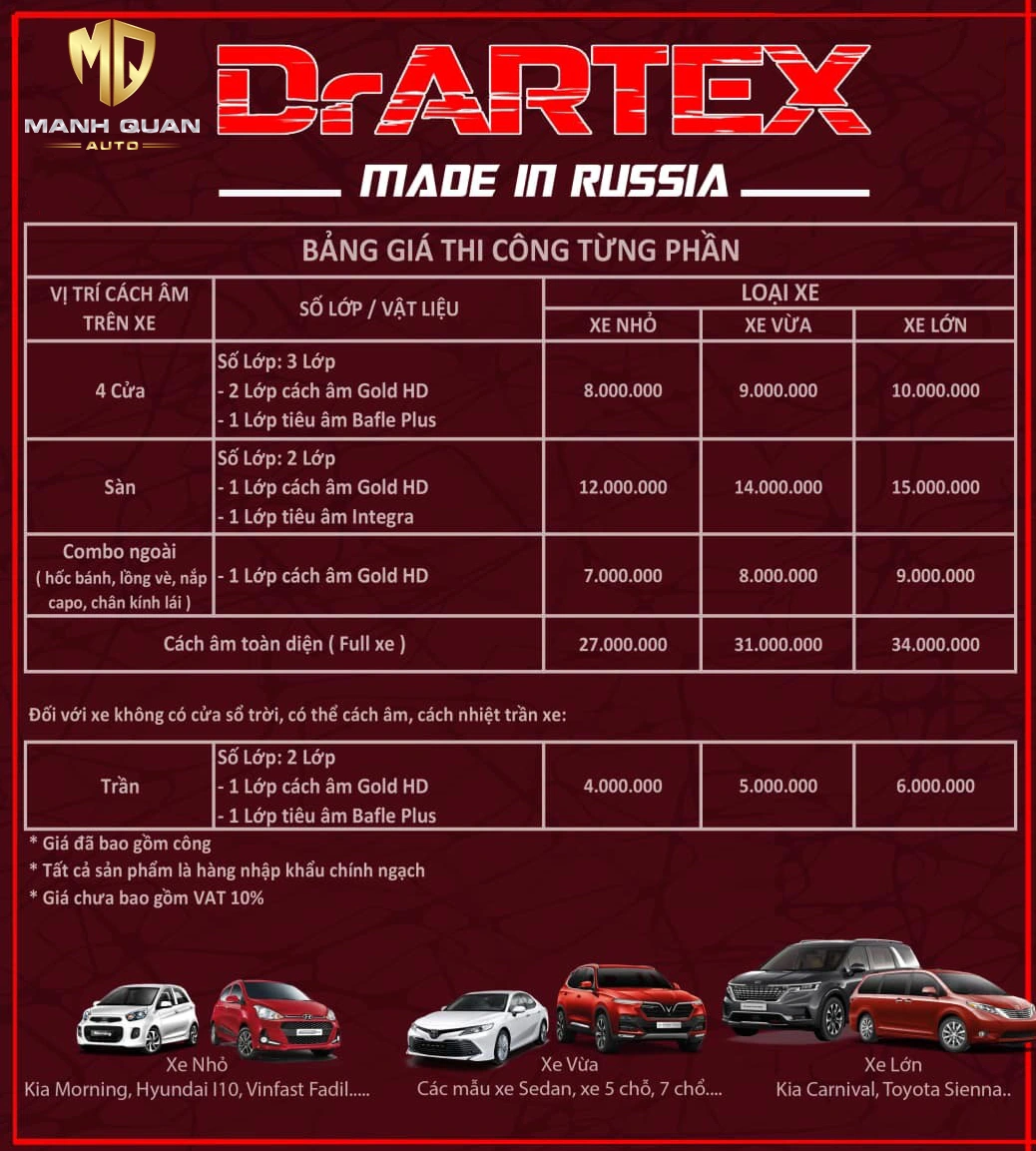 Ví dụ, cách âm cho cánh cửa xe có giá khoảng 8 triệu đồng, trong khi cách âm sàn xe rơi vào khoảng 7 triệu đồng. Nếu bạn chỉ muốn cải thiện một số khu vực nhất định, cách âm trần xe chỉ tốn khoảng 3 triệu đồng. Đối với các dòng xe khác nhau, mức giá cũng sẽ thay đổi như xe 4 chỗ có giá khoảng 26 triệu đồng, trong khi xe 7 chỗ có thể lên đến 32 triệu đồng.