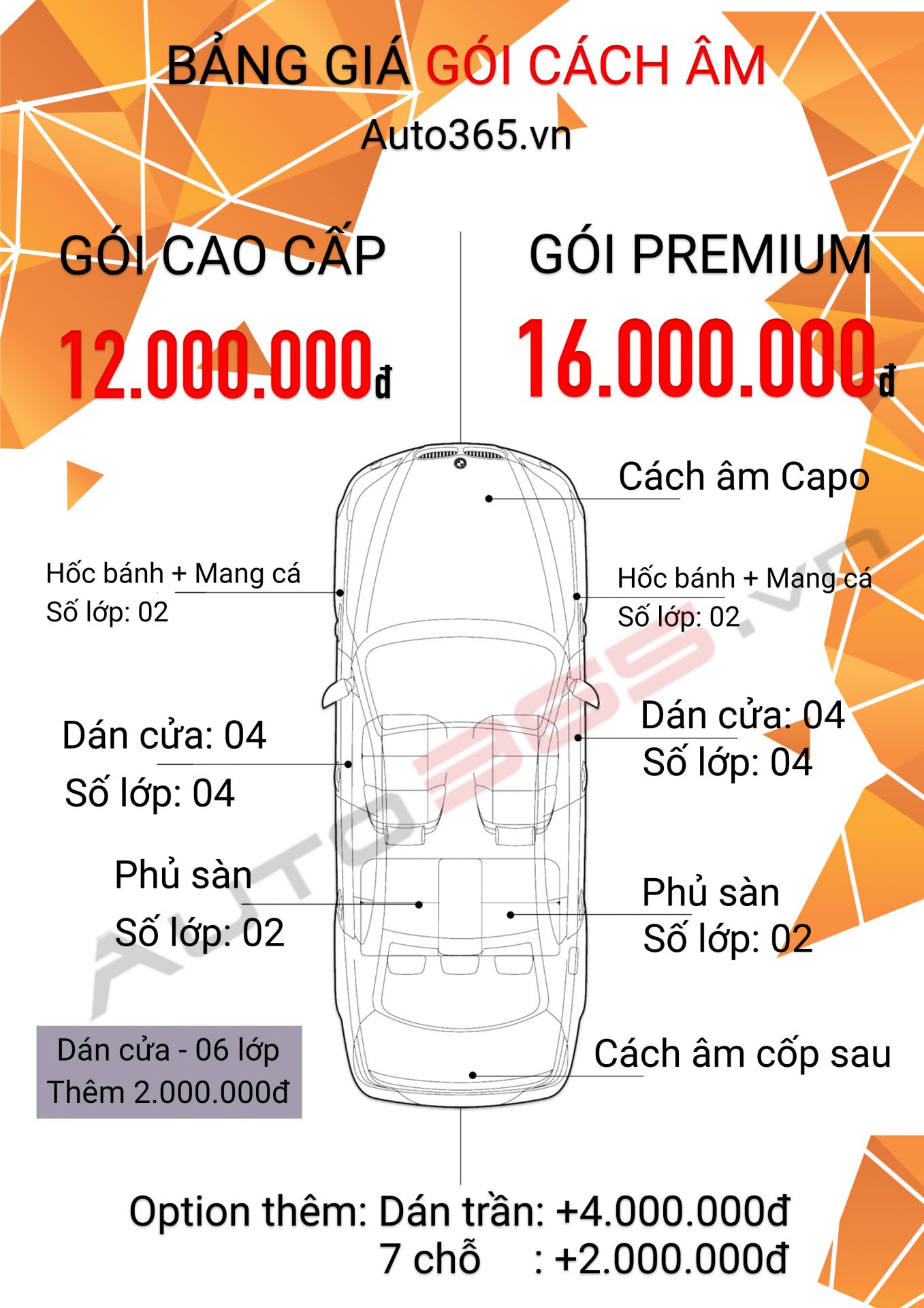 Ngoài ra, dán cách âm cũng là một dịch vụ phổ biến với những gói giá rõ ràng, như cách âm 4 cánh cửa dao động khoảng 9.000.000 VNĐ, hay cách âm sàn xe vào khoảng 14.000.000 VNĐ. Đối với các gói dịch vụ cách âm toàn diện, mức giá sẽ từ 16.900.000 VNĐ cho xe nhỏ, trong khi xe lớn có thể lên tới 20.900.000 VNĐ.