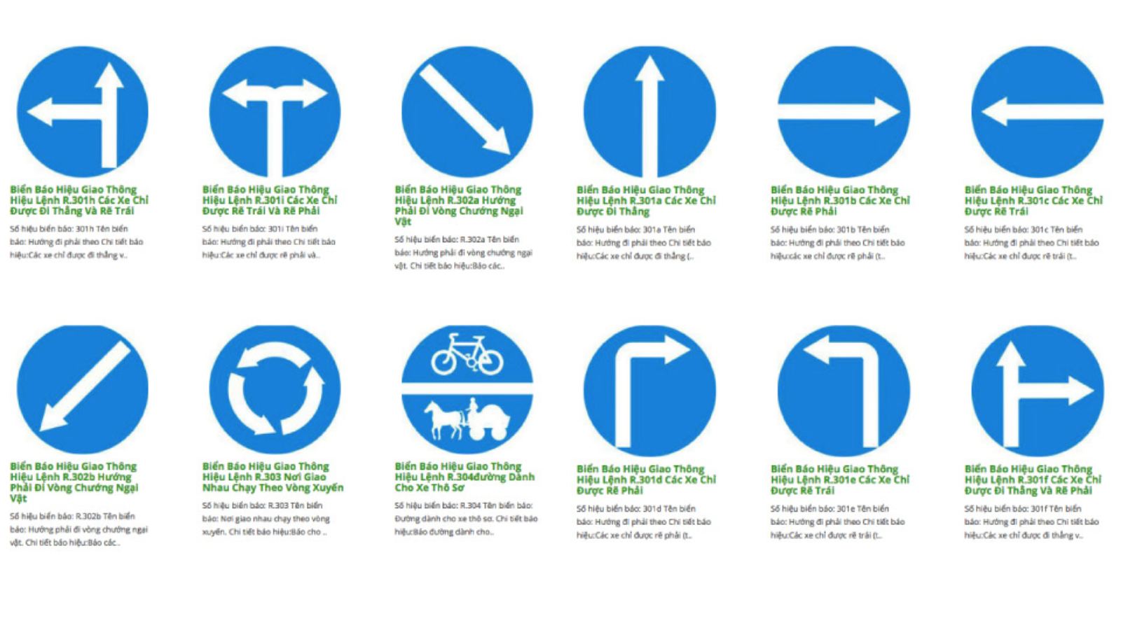 Biển báo hiệu lệnh là một trong những loại biển báo quan trọng trong hệ thống giao thông, giúp điều hướng và hướng dẫn người tham gia giao thông. Chúng chủ yếu có hình tròn, màu xanh dương nhạt với các chi tiết màu trắng, tạo nên sự nổi bật và dễ nhận diện. Những biển báo này thường xuất hiện tại các giao lộ hoặc khu vực cần phân luồng như biển báo “Rẽ trái,” “Rẽ phải” hay “Đi thẳng.”