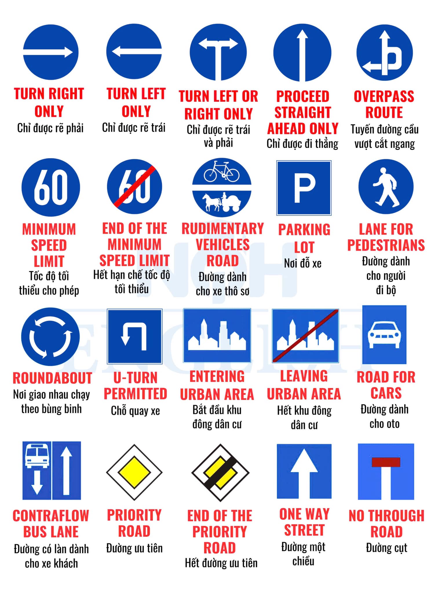 Biển báo hiệu lệnh là một trong những yếu tố quan trọng giúp người tham gia giao thông tuân thủ các quy tắc an toàn. Những biển báo này thường có hình tròn hoặc hình chữ nhật với nền màu xanh và hình vẽ màu trắng đơn giản. Khi hiệu lệnh không còn áp dụng, biển sẽ được đánh dấu bằng một vạch chéo màu đỏ từ trên xuống dưới và từ phải qua trái, giúp người lái dễ nhận biết.